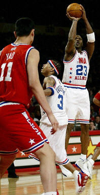 在这个正是提供给明星表演的舞台上,曾一度在人们心中最耀眼的明星姚明却露出了新秀的本色,紧张而拘泥,茫然而慌乱,在场上有限的十七分钟内,姚明似乎是心甘情愿地将表现机会“让”给了那些“老大”。因此,在经历了创纪录的两个加时赛才结束的NBA第五十二届全明星赛后,人们谈论的是乔丹的离去,布拉特的MVP,科比用两个罚球毫不留情地终结乔丹的完美结局,甚至身体笨拙的奥尼尔胯下运球的“娱乐秀”……唯有姚明,不再是人们快乐的源泉。