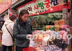 情人节将至,气候寒冷的韩国首都汉城市刮起“情人节热浪”,许多专门销售情人节糖果的专卖店吸引了不少选购情人节礼物的女青年。作者:任晨鸣