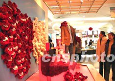 情人节将近,北京中友商厦将上百只毛绒小熊组成红白两颗爱心吸引顾客。作者:廖文静