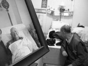 协和医院A级二病房里袁先生病床的床头上还挂着两排醒目的贺年卡,其中一张写着“早日康复,寿比南山”的卡片是袁先生儿子袁伟承寄来的。病床边上的病历本详细记录着袁先生住院期间每天的病况。在病房里,还放着一张袁先生在病中与儿子袁伟承的大合影,照片上的袁先生笑得很灿烂。