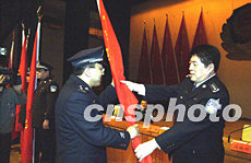 十四日,北京警方举行治安系统“两会”安全保卫动员大会,公安局长马振川(右)为“两会”治安保卫突击队授旗。作者:任海霞