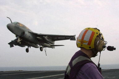 EA-6B“徘徊者”(Prowler)全天候电子作战机通过其携带的反辐射及干扰导弹对敌方雷达、电子通讯设备实施打击及干扰,从而为美陆、海、空三军提供无干扰作战保障。该机型是以A-6“入侵者”战斗机的架构改造而来。由美国诺斯罗普格鲁曼航空航天公司制造,1971年进入海军服役。
