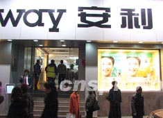 在中国采用“店铺经营并雇佣推销人员”经营方式的美国安利公司,今春公布其在中国内地八十八个城市已经开设九十八家店铺,并于新近在中国推广家居送货、异地定货、电子商务等服务项目。图为美国安利公司设在北京的店铺。作者:王丽南