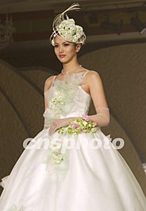 日本著名时装设计师桂由美(Yumi Kotsura)新春在东京展示了她设计的各种婚礼服装。图中的新娘婚礼装以淡绿为基调,点睛之处在手上和胸前的花饰。陶光雄 摄