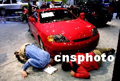 一年一度的美国芝加哥车展正在展览中心举行,数十家世界著名汽车制造商的一千多件展品登台亮相,图为本田汽车展台前,参观者和推销员一起对最新问世的轿车上下打量,仔细研究。作者:王瑶