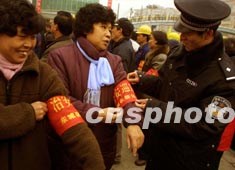 北京市东城警方二十四日举行“警民联防保安全”大会,发动群众协助警方做好“两会”安全保卫工作。目前北京市已有四万多名“红袖标”在街道、社区巡逻值勤。作者:宋吉河