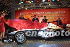 参加2003年世界F1比赛的麦克拉伦·梅赛德斯车队的新型赛车,24日在北京揭幕亮相,随着2004年世界F1比赛进入中国上海国际赛车场,国际各个大牌车队都将在中国进行展示。作者:赵振清