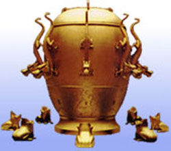 据《后汉书》记载,地动仪以精铜铸造而成,圆径达八尺,外形像个酒樽,机关装在樽内,外面按东、西、南、北、东北、东南、西南、西北八个方位各设置一条龙,每条龙嘴里含有一个小铜球,地上对准龙嘴各蹲着一个铜蛤蟆,昂头张口,当任何一个方位的地方发生了较强的地震时,传来的地震波会使樽内相应的机关发生变动,从而触动龙头的杠杆,使处在那个方位的龙嘴张开,龙嘴里含着的小铜球自然落到地上的蛤蟆嘴里,发出“铛铛”的响声,这样观测人员就知道什么时间,什么方位发生了地震。