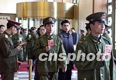 全国政协委员二十七日陆续抵京,北京人民大会堂安检测试工作进入最后阶段。图为解放军工作人员手持两会有效证件在大会堂内进行安检测试。作者:廖文静