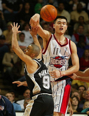 姚明比赛中在帕克的头上传球
