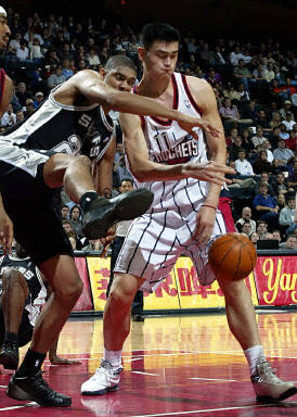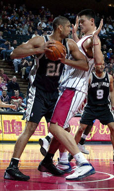姚明在比赛中遭遇对方邓肯的防守