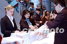 汇丰股控有限公司3月3日公布2002年全年业绩,传媒争先在记者会上领取汇丰股控有限公司2002年全年业绩报告,以第一时间发布新闻。洪少葵 摄