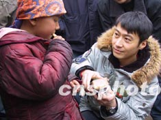 联合国儿童基金会青年特使、香港演艺界明星黎明,4日上午来到新疆巴楚伽师地震受灾最严重的地区琼库恰克乡,看望帐篷小学的学生。作者:闫文陆
