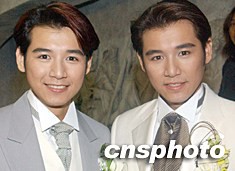 来自台湾的组合TOPTWINZ(陈腾龙、陈跃虎兄弟)三月四日在香港“现代经典”影楼与香港艺员朱茵一起拍摄主题为“花团锦簇”的婚纱晚装作品。钱兴强 摄