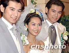 香港艺员朱茵三月四日与来自台湾的组合TOPTWINZ(腾龙、跃虎)在香港“现代经典”影楼拍摄主题为“花团锦簇”的婚纱晚装作品。钱兴强 摄