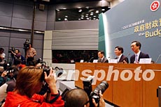 香港财政司司长梁锦松与财经事务及库务局局长马时亨等官员,3月5日在政府总部举行记者会,就刚发表的2003至2004年度财政预算案,回答记者问题。洪少葵 摄