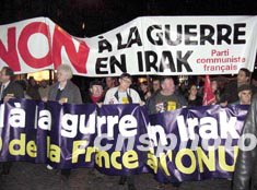 法国巴黎五日再度举行反战示威游行。数以千计的青年学生、左派人士走上街头,高呼“要和平,不要战争”的口号,反对美国出兵攻打伊拉克。图为由法共组织的游行队伍在夜色中行进。作者:蔚中