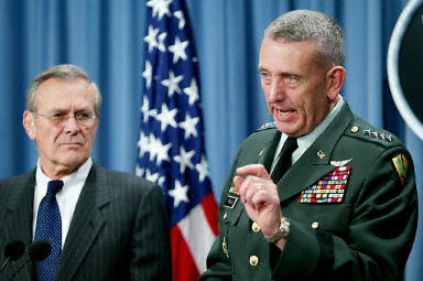 3月5日,在美国华盛顿五角大楼,美国国防部长拉姆斯菲尔德(左)和美国中央司令部司令弗兰克斯出席记者招待会。弗兰克斯说,美军目前已经为对伊拉克采取军事行动作好了准备。