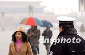 三月六日清晨北京瑞雪纷飞,参加十届人大一次会议第二次全体会议的政协委员和人大代表冒雪赴会。作者:盛佳鹏