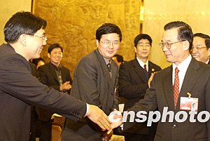 中共中央政治局常委、国务院副总理温家宝六日下午参加了十届全国人大湖北代表团对政府工作报告的分组审议,与代表们握手致意。作者:廖文静