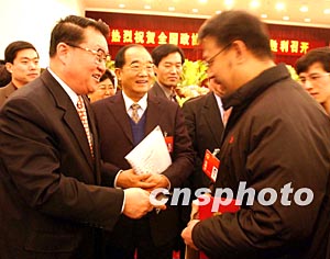 中共中央政治局常委李长春三月七日到政协十届一次会议文化艺术界听取委员们的建议意见后,与电影演员兼导演的姜文交谈。作者:贾国荣