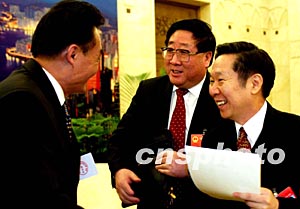 国务院港澳办副主任陈佐洱(右一)七日参加香港人大代表团分组讨论,与吴邦国、高祀仁(右二)交谈。作者:郑萍萍