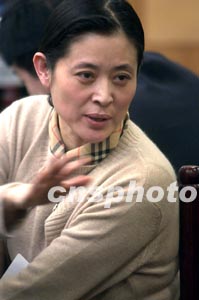全国政协委员、电视主持人倪萍在七日的分组讨论会上呼吁关注农村普教问题,对贫困山区发放“教育券”来保障教育资金的专款专用。作者:廖文静