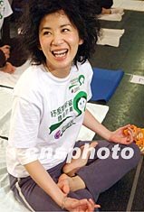 香港艺员吴君如,在三月八日香港举行的“百人纾压瑜伽日”活动上苦练瑜伽功。钱兴强 摄