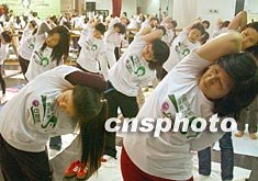 “白兰氏”与香港各界妇女联合协会,三月八日在香港举行“百人纾压瑜伽日”活动。图为众多女士练瑜伽功。钱兴强 摄