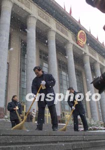 三月十日,北京人民大会堂的工作人员及时清扫台阶上积雪。作者:史利