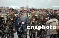 三月十日,十届全国人大一次会议第三次全体会议遇北京大雪,解放军代表们冒雪参加会议。 盛佳鹏 摄