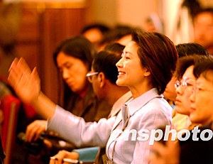 中国中央电视台的节目主持人王小丫三月在北京采访全国人大十届一次会议的记者招待会,前一天九次举手未获提问机会,如今终于如愿以偿。作者:贾国荣