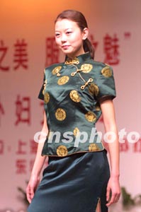 十二日,在上海东华大学举行的一场时装秀上,东华大学学生展示一款由学生自己设计的唐装,独具风韵。作者:汤彦俊