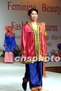 十二日,美、英、法等22国驻沪领事夫人们齐聚东华大学,参加主题为“女性之美,服装之魅”文化交流活动。活动中领事夫人们还兴致勃勃的走上T台展示各自独具魅力的民族服饰。图为领事夫人们在展示民族服饰。作者:汤彦俊