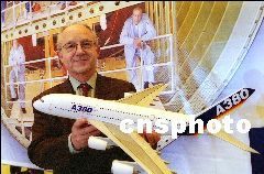 欧洲空中客车A380被称为当今世界最大的豪华客机,上下双层载客555人,将为北京奥运会服务。图为空中客车中国公司总裁马乐德先生介绍发展远景。(资料图片) 贾国荣 摄