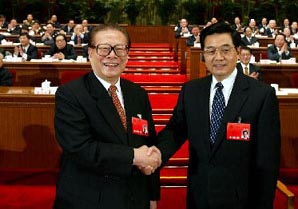 ——中共中央总书记胡锦涛当选新一届国家主席。选举结果一经宣布,全场响起长时间的热烈掌声。胡锦涛在掌声中起身向会场代表三鞠躬,并与前任国家主席江泽民亲切握手。