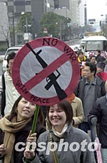 东京市民十五日在市中心的一处公园内集会,并在繁华的银座商业街游行,反对美国准备对伊拉克发动战争。作者:陶光雄