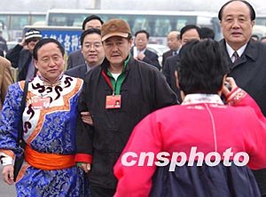 全国人大代表赵本山三月十五日前往北京人民大会堂参加十届人大一次会议的选举,一边走一边应其他代表的请求合影。作者:贾国荣