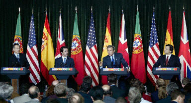 3月16日,在葡萄牙亚速尔群岛的特赛拉岛上的美国空军基地,美英西葡四国首脑在举行紧急会晤后举行记者招待会。