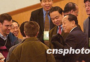在三月十七日举行的十届全国人大一次会议第七次全体会议上,李肇星获任外交部长后,外国记者纷纷上前表示祝贺。作者:张炜