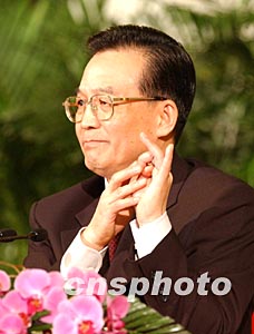 被瑞士驻华大使称为具有计算机头脑的中国新任总理温家宝,三月十八日在中外记者招待会上用数字手势述说国家的前景。作者:贾国荣