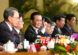 图:温家宝和副总理们一起与记者见面