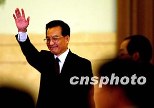 新任国务院总理温家宝十八日在北京召开记者发布会,挥手向记者致意。作者:郑萍萍