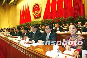 十届人大一次会议十八日上午在北京人民大会堂闭幕,图为刀美兰、于均波、习近平(从右至左)等代表们按表决器通过各项决议。作者:毛建军