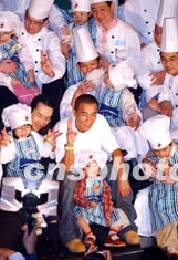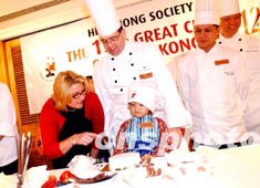 为宣传即将在4月举办的"第12届全港厨师精英大汇演",城中多位名厨18日在君悦酒店与协康会小朋友一起参与别开生面的厨艺比赛。洪少葵 摄