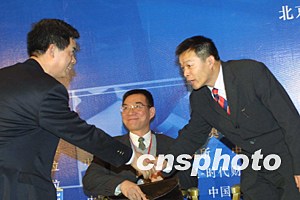 中国新闻社副社长兼总编辑郭招金(左),三月二十二日与经济学家林毅夫(中)、胡鞍钢(右)相聚在“首届中国竞争力论坛”上。作者:史利
