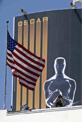世界电影界年度盛事之一的奥斯卡颁奖典礼,将于美国西部时间23日夜(北京时间24日上午)举行。时值伊拉克战事进入白热化之际,洛杉矶警方已布下重兵,防止恐怖攻击。图为奥斯卡典礼会场顶楼,一名警察在照片右下方的小金人肖像前的制高点进行监控。(美联图)