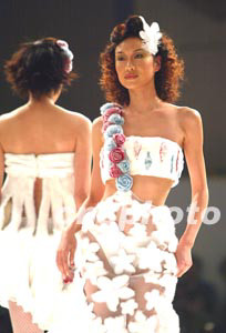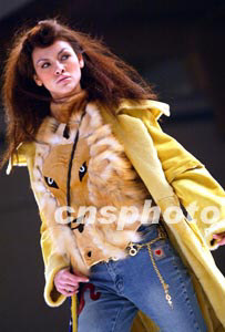 模特二十五日晚在北京举行的中国国际时装周上展示做工精美、设计独特的2003香港新款皮草时装。毛建军 摄