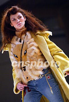 模特二十五日晚在北京举行的中国国际时装周上展示做工精美、设计独特的2003香港新款皮草时装。作者:毛建军