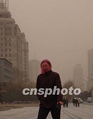 二十六日上午,长春市还是阳光明媚,下午忽然“天公变脸”。市区天空一片暗黄,路人不得不用口罩、帽子、纱巾等将头部“武装”起来,在风沙中低头疾行。作者:韩丹